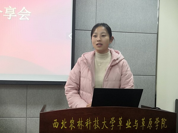 最后,由“褪黑素调控低温/干旱胁迫下多年生黑麦草生长和活性氧的清除的机制”队长尉欣荣同学分享了她的创新比赛经验,她谈到对于创新比赛而言,最重要的是手里有文章。创新较创业有较大的区别,它是一个漫长的过程,需要同学们在大量的实验基础之上进行文章撰写,然后查询相关资料,做足充分准备。在此过程中,不仅可以对文章有深度解析,更能发扬同学们勇敢拼搏的精神,为之后的科研路奠定良好的基础。