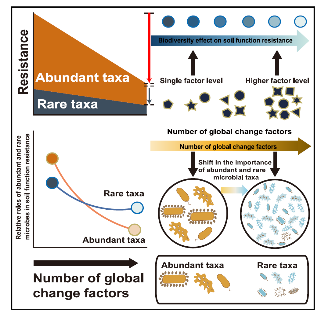 全球变化因子(Global change factors,GCFs),如增温、氮沉降、盐碱化和环境污染等,对陆地生态系统的结构和功能产生了深远影响。生物多样性可以缓冲生态系统的功能以对抗环境变化。然而,土壤微生物多样性,特别是丰富和稀有微生物类群在不同GCFs数量干扰条件下对土壤多功能抗性的调控作用尚缺乏深入研究。