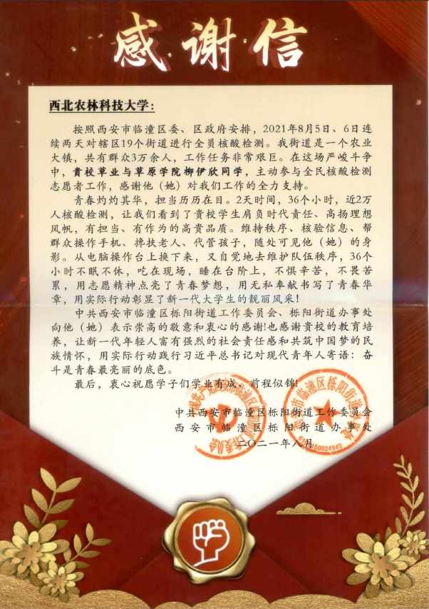 近日,我校草业学院收到一封来自陕西省西安市临潼区栎阳街道党工委、办事处的感谢信,信中工作人员对永利集团3044欢迎光临草业科学2021级新生柳伊欣同学在疫情期间主动投入一线参与全民核酸检测志愿者活动并给与了高度评价,对永利集团3044欢迎光临发来感谢信表达了衷心的感谢。