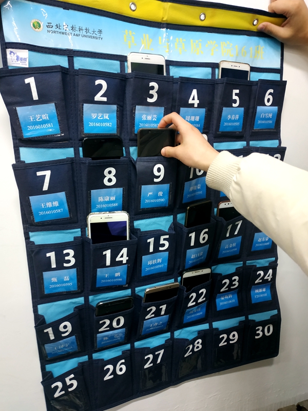 3月1日,草业学院学生走进教室准备上课,与以往不同的是,每个班级都多了一个手机袋,学生纷纷自觉将手机“寄存”在教室前的手机袋中。