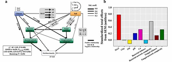 进一步分析表明微生物群落多样性对多功能性的影响是由微生物网络复杂性间接驱动的(图3)。