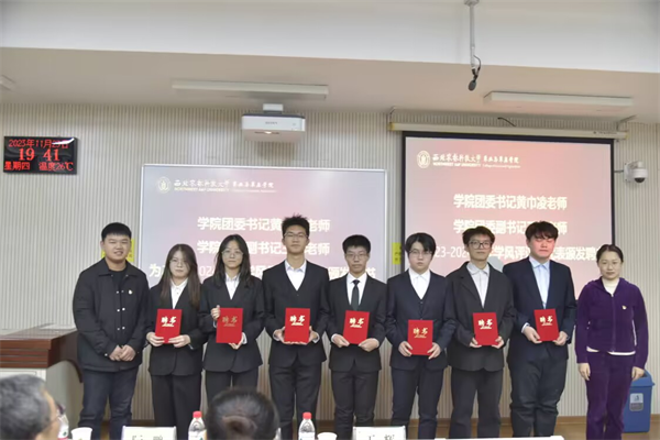 学院团委书记黄巾凌老师、学院团委副书记王辉老师2023-2024学年学风评议员代表颁发聘书并合影留念。